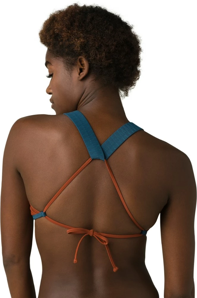 Poolside vacation, here you come. The prAna Valdara swimsuit top is a high-neck top with padded, fused shoulder straps with decorative stitching and an open back.